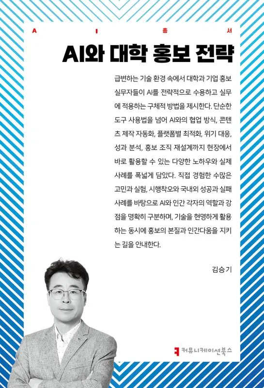 AI는 대학 홍보의 환경을 근본적으로 재편하고 있다. 생성형 AI가 대학 홍보 실무·조직·전략 전반을 어떻게 재편하는지 분석하고, 실무자가 갖춰야 할 다섯 가지 역량과 조직 전환의 핵심 방향을 제시한다. AI 시대, 대학 홍보팀이 변화 속에서 방향을 잃지 않도록 돕는 실전형 전략서다.