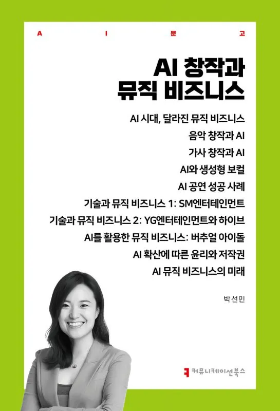 AI로 변화한 제2의 디지털 혁명 01 AI 시대, 달라진 뮤직 비즈니스 02 음악 창작과 AI 03 가사 창작과 AI 04 AI와 생성형 보컬 05 AI 공연 성공 사례 06 기술과 뮤직 비즈니스 1: SM엔터테인먼트 07 기술과 뮤직 비즈니스 2: YG엔터테인먼트와 하이브 08 AI를 활용한 뮤직 비즈니스: 버추얼 아이돌 09 AI 확산에 따른 윤리와 저작권 10 AI 뮤직 비즈니스의 미래